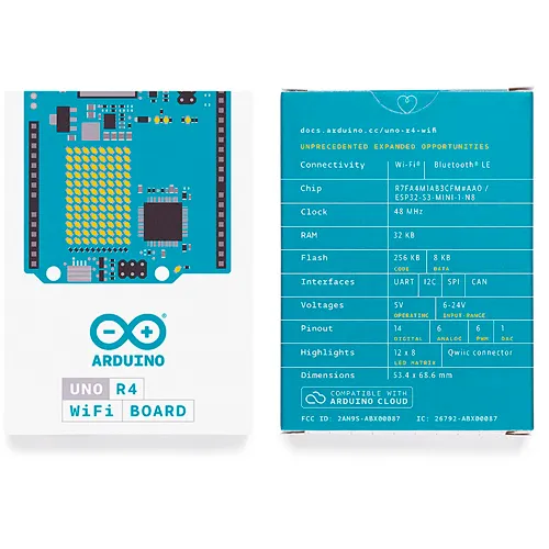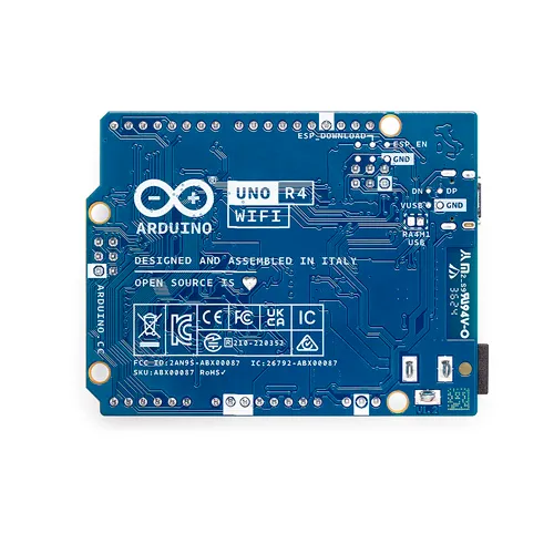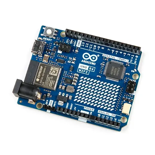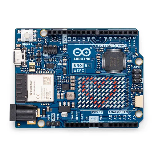 Arduino UNO R4 WiFi (oficial). Basado en RA4M1 + ESP32-S3 WiFi. 20 GPIO, 6 entradas analógicas, USB-C, RTC y acelerómetro. Ideal para IoT, proyectos conectados y robótica moderna.