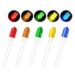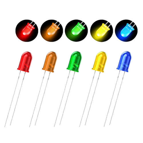 Incluyen los colores más usados: rojo, naranja, verde, amarillo y azul, todos con terminales estándar de 2 pins (anodo/cátodo) y compatible con montaje en protoboard o PCB.
