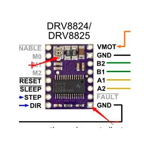 - El DRV8825 disipa más calor que el A4988 — siempre usa un disipador de aluminio (incluido en algunos kits) o ventilador si operas >1.5A.