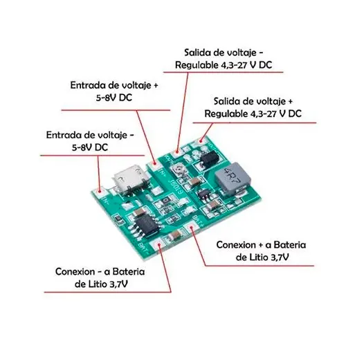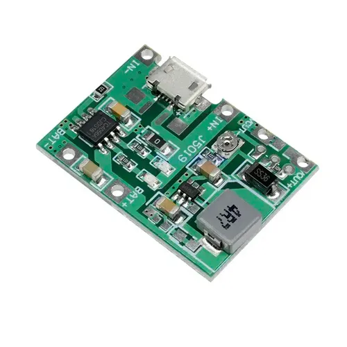 Ideal para alimentar Arduino, ESP32, sensores, displays o cualquier circuito que necesite 5 V mientras la batería se carga — sin necesidad de interruptores ni cables adicionales. El puerto micro-USB lo hace compatible con cargadores estándar, power banks y fuentes de 5 V.