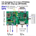 Módulo J5019: cargador TP4056 + elevador MT3608 en uno. USB micro-B, salida 5V/1A. Ideal para proyectos portátiles con batería 18650. ¡Carga y alimenta al mismo tiempo!