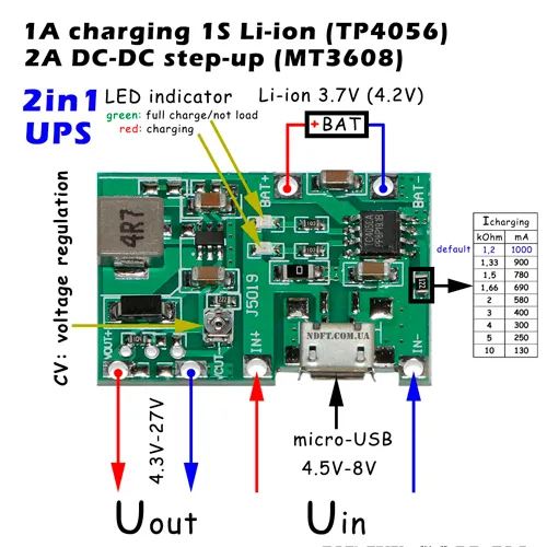 Módulo J5019 de carga elevador baterías lipo litio 18650 mUSB