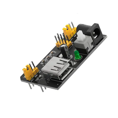Módulo MB102 para protoboard: salida 5V/3.3V regulada, entrada DC 6.5–12V. Incluye interruptor, LED indicador y terminales. Ideal para Arduino, sensores y prototipos.
