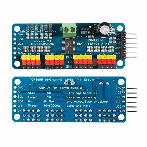 Controlador PCA9685 de 16 canales PWM. Ideal para servos, LEDs o motores. Interfaz I2C, frecuencia ajustable (24–1526 Hz). Compatible con Arduino/ESP32. ¡Controla hasta 16 servos con 2 cables!