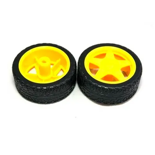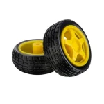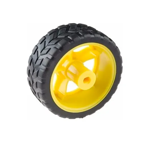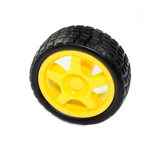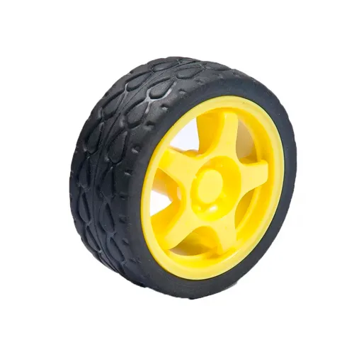 Rueda robótica 68 mm con llanta de goma y cubo amarillo. Ideal para robots móviles, carros RC o proyectos DIY. Incluye eje de 6 mm. ¡Robusta y silenciosa!