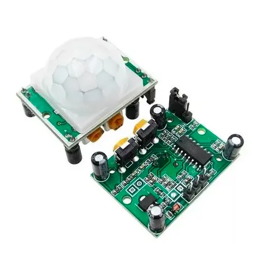Sensor PIR HC-SR501 para detección de movimiento. Ideal para Arduino/ESP32. Rango hasta 7 m, ajuste de sensibilidad y tiempo. Perfecto para alarmas, luces automáticas o proyectos IoT.